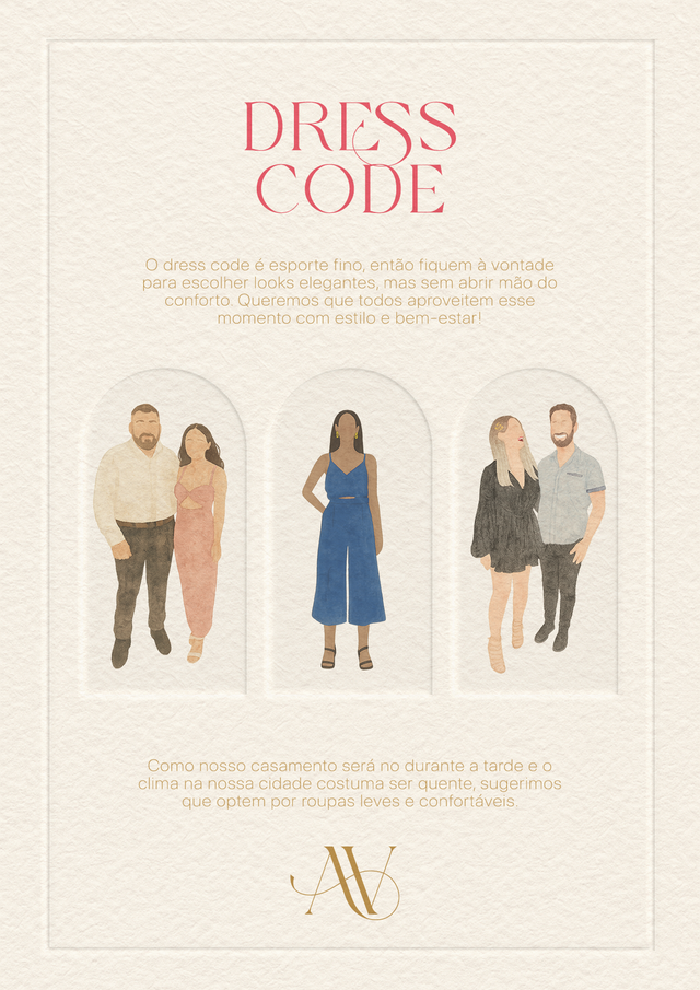 Como nosso casamento será durante a tarde e o clima na nossa cidade costuma ser quente, sugerimos que optem por roupas leves e...